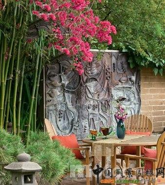 庭院一角的墻邊上豎立著一面名家設計的陶瓷質地淺浮雕。墻面后面是庭院中的溫泉水系,從庭院上層蜿蜒而下。一面矮磚墻和四周栽種的竹子有效地遮擋了來自庭院外圍的視線,保護了主人的隱私。