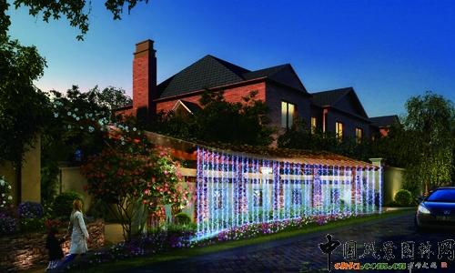 北入口廊架:廊架構造,木質壓頂給人以厚重、親切的感覺;石砌基礎增加整體體量感;在夜間燈光照射下,水簾的輕盈、吉祥花境的若隱若現烘托浪漫溫暖的氣氛。
