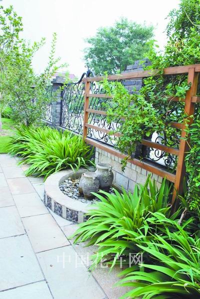 圍墻邊的水景小品古樸而可愛