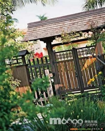 花園的大門設計別具匠心,木門木瓦的傳統樣式讓人在門外就感受到懷舊、質樸的東方氣質。將園門向院內退入1米空間的設計,讓人感覺到庭院的幽深感,也為門口位置提供了更加充足的種植空間,豐富了花園的立面層次。園門配合四周的竹柵欄,阻隔一定的視線,更增加了花園的審美情趣。