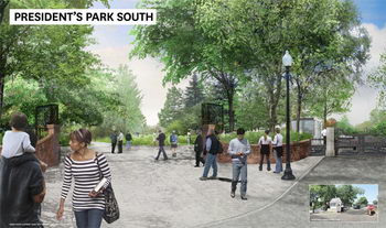 盡管橢圓草坪較好的應付四季的活動,但是日復一日如此下去,游覽者可能會感覺52公頃的草地不再受歡迎。在 L’Enfant的想象中,這里是一個連接白宮和紀念核心的重要橋梁,今天的南總統花園缺少的是適合的人的尺度。這項計劃可以活化橢圓結構,靈感來自于安德魯.杰克遜.唐寧1851年的“榆樹蔭道、車輛道、蔭蔽小樹林的行人道系統以及有此環繞的大圓形開放空間”。橢圓形的四個角都有入口,通向新的道路系統,路邊種滿了樹木,低矮草叢,大量的座椅和其他景觀加強了橢圓草坪與白宮和國家紀念碑的連接性。