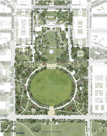 南總統公園散步道和重建的橢圓草坪將原本沖突兩種目的結合起來,從一方面說,確保政府的安全性是永恒的條件,從另一方面說,增加游客對總統府邸的體驗效果。我們的目標就是將這兩個目標整合起來,從而直接表達出人的自由與莊重。南散步道采用有效的安全策略,為行人創造了一種莊嚴感。以這種方式,散步道整合了兩種國家最重要的文化景觀,第一是白宮的南草坪,在這里居住的歷屆總統都對其進行過翻修,而且杰出的景觀規劃設計師奧姆斯特德參與草坪的設計,第二是橢圓草坪使了有待發展的連續的統一的設計,由景觀幻想家:喬治.華盛頓,Pierre Charles L’Enfant,托馬斯.杰斐遜,安德魯.杰克遜.唐寧和奧姆斯特德。