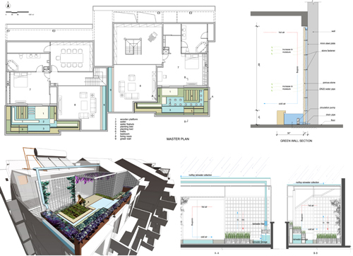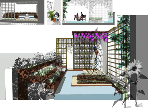 由于北京較惡劣的氣候時間很長,兩個主要臥室外的陽臺得不到高效使用。改造設計是將它們轉化為溫室花園,一個是服務于廚房的生產性蔬菜園,另一個是為主臥室準備的可食用芬芳花園。溫室罩面用玻璃和遮陽格柵結合而構成,以便控制光線進入強度,設計可以手動開啟的窗戶,使小氣候得以方便進行地人工調控;在屋頂安裝太陽能光熱板,收集的太陽輻射提供家庭廚房及洗浴需要的熱水。這兩個花園的平面布局和空間結構完全相同,由中間的水池和汀步構成的花園,允許人們到達每一個角落。一個木質平臺漂浮于水面上,從臥室中伸展出來,可以成為納涼和晨練的場所,業主甚至可將它作為可以仰觀星星的另一臥床。種植槽由鋼板制成,呈臺地式布置四周,這樣為種植區節省了空間,也使得植物能夠充分接受陽光。種植槽內以適合場地的尺寸靈活劃分,槽內放置可拆卸的種植箱,又便于后期的清理維護。臺地狀的種植槽底部預留儲水箱,用來儲存從屋頂收集的雨水。這些雨水可以用來灌溉花園中植物,同時,水體具有蓄熱功能,可緩解冬季的嚴寒和夏季的炎熱。輕質多孔的上水石堆積起來,同樣可以調節濕度和溫度,還為苔蘚類植物提供了生長的空間。面向花園的臥室外墻面和溫室頂部由木格柵構建,木格柵采用3cmx3cm木條以20cmx20cm間距排布,以便垂直綠化,使空間的尺度和質感更加宜人,并調節作用進入溫室內的光線。