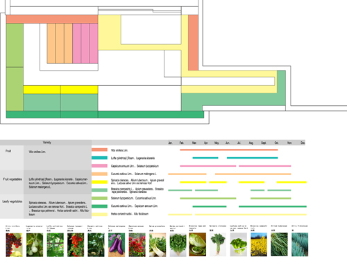盡管布局相同,但兩個陽臺花園選用植物材料完全不同。在蔬菜園中,通過對種植槽中不同蔬菜的色彩、高度、形態、習性的選取,制定了四季可以輪作的種植方案:花園春季可以采收香菜、油菜,夏季可以品嘗番茄、黃瓜,秋季可以收獲葫蘆、葡萄,冬季可以樂享生菜、辣椒。這些蔬菜的產量相當可觀(見表1),主人可以每天享受一盤沙拉,以及一些豆類和水果等。