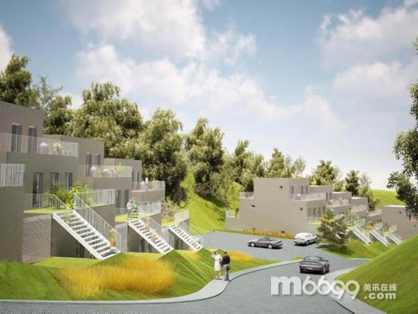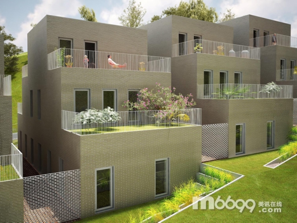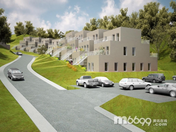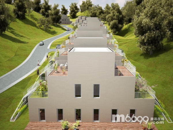 住宅的設計方案是建造一個重復的二層單元建筑,每兩個單元相互堆疊:單層平方建在第一層,二層公寓布置在頂部。4個單元建筑為一組,每組建筑群都以階梯式序列排布。