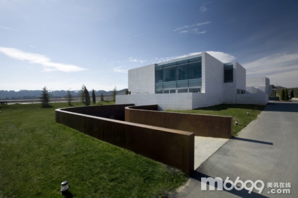 單獨的空間通過內(nèi)部結(jié)構(gòu)連在一起,形成了一個重疊的、連續(xù)流動的空間。實際上這座建筑可以分成內(nèi)部含有房間的三個單獨的建筑,它們分布在與地平線同一水平地帶,同時通過遮掩屋內(nèi)設(shè)施的水平元素連接起來。廣闊的綠色屋頂將這座建筑和周圍環(huán)境融為一體,同時建筑本身強烈的現(xiàn)代感設(shè)計與周圍的環(huán)境形成對比。