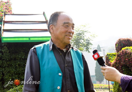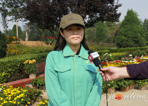 “我每天早上七點鐘準時到澤州公園開始我一天的工作,我的工作主要是按照圖紙擺花的造型,根據花的造型挑選和調整花的高低、顏色并擺放成型。像我身后這樣小點的造型每天要擺五六個約有1000多盆花卉,基本上是在晚上8點左右下班。”
