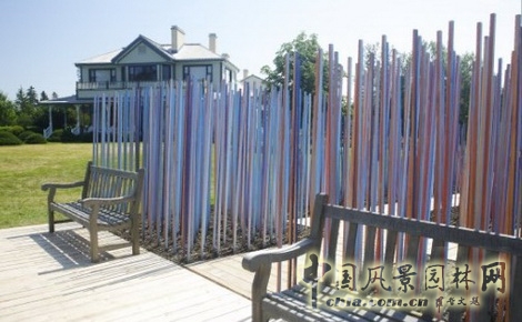 一進入花園,我們所看到的就是傳統(tǒng)的藍色罌粟花,它們像是被掃描了的像素化了的,轉(zhuǎn)變成為一系列長長的瘦高的柱子。然后,這些柱子被栽種上,形成一個抽象的組合邊界區(qū)。三面都畫有藍色,一面畫橘黃色,柱子創(chuàng)造了色彩的效果,簡單卻能給人驚喜:游客徜徉于迷宮般的體驗中,視野中的景色在不斷轉(zhuǎn)變著。感官接觸體驗重新闡釋了色彩和運動的潮流,融入了當代視覺感染力,這些是從Elsie Reford原始花園中呈現(xiàn)出來的。