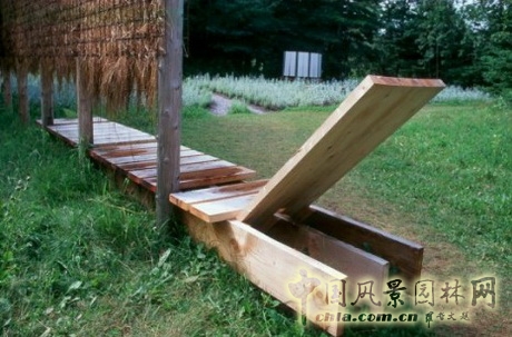 在公園主軸上,長矩形中心,是一塊紀念石。游客被吸引著,躺下來,仰望蔚藍的天空,感覺和風的吹拂,呼吸陽光的味道,在樹間穿梭起舞。在花園的西北角,放置了一個大型號的躺椅,設計師在其背后放置了稻草籬笆,躺椅仿佛舒適地倚靠這稻草籬笆。游客突然間意識到花園是懸于海水上方的一個陡坡上,下面的波浪沖刷海岸。在花園南邊,一個圓木制成的半圓形長凳為好奇者提供了一個神秘的空間,被一塊幕遮擋,與花園分隔開來,另一側(cè)用木頭偽裝起來,這里提供了一個很好的視角觀察道路,甚至觀察由此來往的游客。