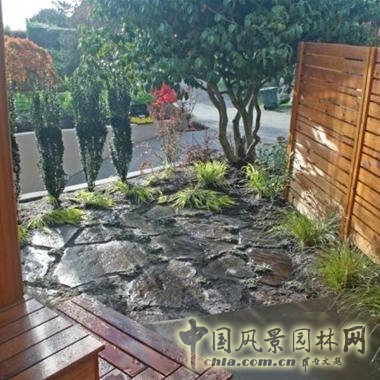 這個(gè)小的庭院邊上的平臺(tái)通過(guò)應(yīng)用對(duì)比明顯的材質(zhì)使庭院顯得更加豐富活潑,包括巖石板、木制板和松柏綠籬。在平臺(tái)下面還種植有鈍齒冬青和均等間距的日本冬青。