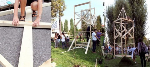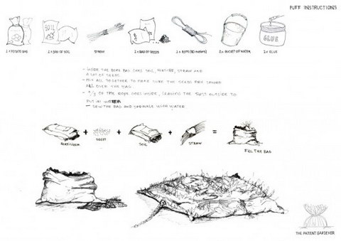 我們愛草椅(這是一個定制的紙板結構,其形狀為了實現最大程度的放松,表面涂以保護涂層,之后里面填滿土壤,并松軟地覆蓋上草披)和蓬松的草鋪(裝土豆的大袋子里裝滿稻草,土壤,肥料和草種),一個有機繩子放入袋子內三分之一的長度,然后和袋后縫在一起其余的繩子放入水中,這樣蓬松的草鋪可以得到水,然后草就可以生長出來覆蓋整個表面,所以當樹木最終長到這個高度,成了地板,草鋪也同時長好了。