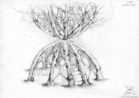 至于家具,建筑師在地面上設計了家具,家具用草,樹木和植物制作,包括用餐區,有一張桌子和四把椅子。梅樹將用來做椅子,樹枝被引導伸向檐篷,以便未來來訪者可以坐在椅子上,同時間吃著美味的水果。桌子是由細長的木質構成,形成了一個骨架。