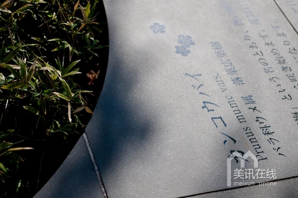 在通往住宅的主要入口,有塊匾和一個標志性的樟腦樹,人們稱之為“時間之樹”。匾上雕刻著Fujimi Ni-Chome和東京(江戶)的歷史和圖畫。從中央的樟腦樹開始,各種線條像樹根一樣向周圍擴散開來,構成一個樹形圖,講述著古老的信息和新信息。這些信息大部分都追溯了從江戶(東京古時的舊稱)時期該區域日本武士住宅的歷史到現在,大致分為三類:“Fujimi Ni-Chome歷史”,“江戶/東京歷史”和“自然歷史”。隨著往這樹形結構的中心慢慢推移,信息也逐漸變得不同。設計師的目標就是要隨著時間的推移,在這些故事之間建立聯系。