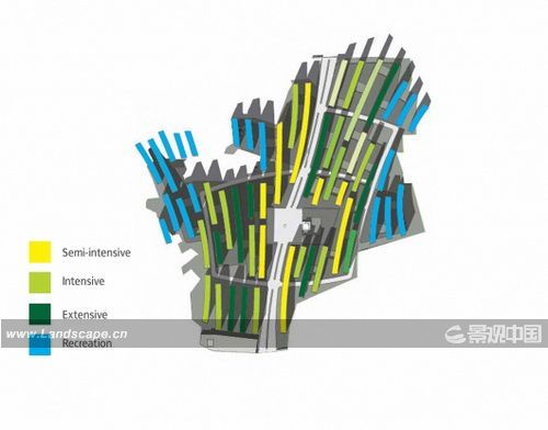 為了直接引導雨水流走并阻止雨水溢出,項目運用了生物洼地的方法,洼地布置在整個地平面道路的邊緣。生物洼地同時也作為雨水的過濾系統,保留過量的雨水用于正在建設中的花園和公園的灌溉。為了貯存多余的暴雨水,綠色屋頂被設計來緩解溢流,同時幫助水和空氣凈化。此外,這些系統能夠降低建筑的總能耗,緩解城市的熱島效應。綠色墻體作為一種空氣的過濾系統,創造了自身微氣候的同時降低了單元里的熱量,也降低了室內空氣和室外的輻射溫度。為了加強交叉通風,采用輕薄的外輪廓和樓板,順應了本地的主要風向,產生了獨具特色的外型,同時也為單元內各個角度的房間提供了自然采光的機會。