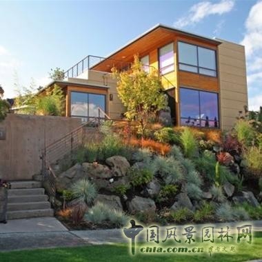 庭院位于美國華盛頓州西雅圖市的西北部,造價8萬到10萬美元。庭院位居高處,卻是一個相對隱蔽的居住空間。設計的主要元素是與背景墻顏色一致的17層混凝土階梯、混凝土平臺、天臺、矮景觀燈、雪松綠籬、種植當地植物的容器等。
