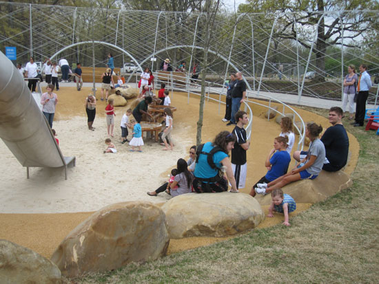 謝爾比農(nóng)場公園的林地探索游樂園是有James Corner Field Operations公司設(shè)計(jì)的,目的是恢復(fù)林地,同時(shí)改善兒童健康。4.25英畝游樂園的設(shè)計(jì)是基于兒童的游戲理論,同時(shí)也廣泛征求家長和孩子們的想法。在游樂區(qū)使用可回收鞋材,在網(wǎng)和樹屋的游戲房下使用的是靴材。滲透性的材料可以使雨水滋養(yǎng)游樂房周圍的喬木等本地樹種。