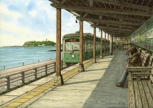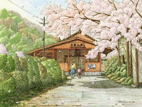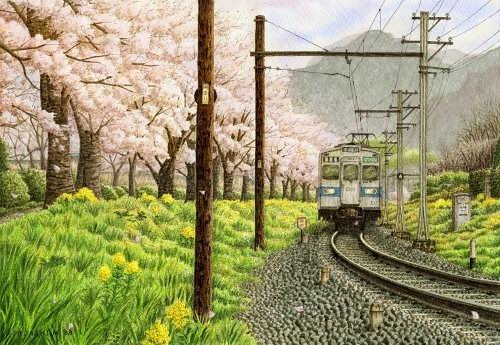 松本忠——日本鐵道畫家。通過旅行,將沿途風景定格在插畫中。作品集“鐵道油漆插畫”清新自然,展現出日本福島縣沿鐵路的美麗景色。獲得日本“詩とメルヘン”插畫榮譽提名獎。列車之旅,沿途不經意的風景,櫻花飛舞的無人車站,塑造出節奏強烈的風景線。