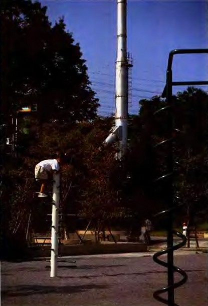 把緩坡綠地引入公園內,并設置匯集雨水的修井池。作為街區文脈的"記憶之丘"設置了充滿生機的草坪之丘。休閑亭(眺望之家,谷之家,街之家,水之家)四種變化各異的造型,滿足了人們在長時間的活動后停留的需要,被巧妙地設置在整體的自然環境中。除設置了游具的廣場之外,還設置了"田野"等能自由自在活動游玩的空間。以上的空間均配置了簡潔的構筑物,在高低起伏的彎曲園路邊散置著時隱時現的設施,景觀氛圍和連續多彩的景觀效果得到了充分的表現。