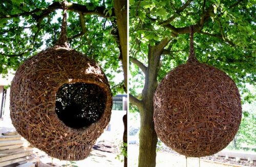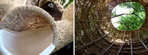 Porky的系列作品“weaver”s nests”沒有起支撐作用的鋼架結(jié)構(gòu)。每個大鳥巢都是用例如樹皮、樹枝等自然材料一點一點編織出來的。最終成形的作品十分堅固,可以容納兩個成人。
