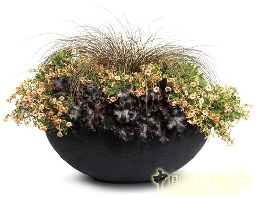 中國風景園林網訊 黑色是時尚色系,可以平衡花園的色彩搭配。灰色可以作為黑色的背景顏色,凸顯黑色。青銅色或琥珀色和黑色搭配可以產生自然的景觀效果。這幾種顏色可以營造出萬圣節的靈動氣氛。而出人意料的顏色組合花境組合,可以給人一種豁然開朗的愉悅感。花紅葉綠的色彩和枝條錯綜復雜的交織,然后反襯黑色系植物的姿態。