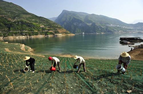 近日,當地農民在三峽庫區湖北省宜昌市秭歸縣香溪河口馬槽嶺為消落帶草坡澆水。光禿禿的消落帶一直以來是三峽庫區蓄水以來生態治理的重點。日前,湖北秭歸三峽庫區香溪段開始在消落帶種植“長根系”草本植物,探索破解三峽水庫消落帶的綠化、護坡和生態修復等難題。新華社發(鄭家裕 攝)