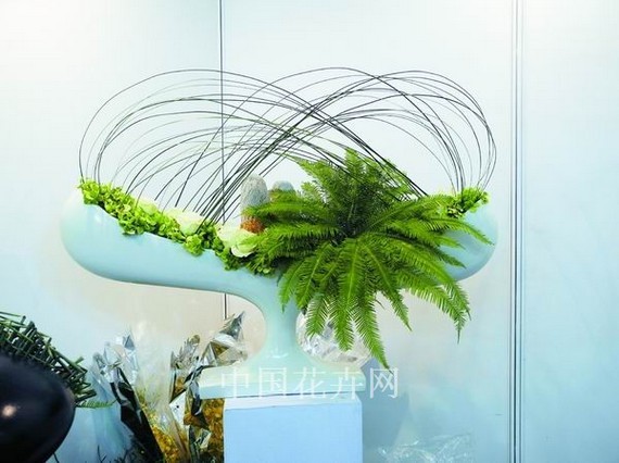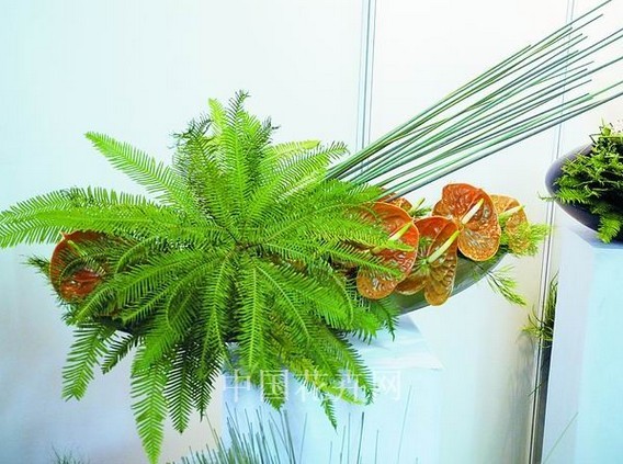 “澳洲剛草有很多種,有的切面是四方棱形,又脆又硬,有的切面是扁形,很柔軟。在俄國(guó)和日本,花藝師會(huì)將剛草整把彎曲后做造型,以花來點(diǎn)綴,而不僅僅是用它拉出線條。伸縮切面是圓的,很細(xì),有韌性,可以完成八字形做新娘胸花。長(zhǎng)達(dá)兩三米的吉密葉,特點(diǎn)是寬、扁、長(zhǎng),做酒店大堂花或酒會(huì)大型作品時(shí)用它“打底”非常棒。”說起這些葉材,考察過多個(gè)國(guó)家切葉市場(chǎng)的王興國(guó)滔滔不絕。謝明也向記者表達(dá)了他的感受,“澳洲野生葉材會(huì)給人耳目一新的感覺,它們新鮮、干凈又環(huán)保。由于其更具柔軟性,因此可塑性很強(qiáng),很容易激發(fā)花藝師的創(chuàng)造靈感。”