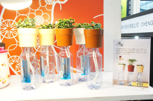 一般植物的栽培都需要經常進行澆水灌溉,但在文博會上記者看到一款小創意產品,通過灌好水的小瓶子和鏈接水瓶與盆栽底部的棉簽裝置進行潤土作用,起到灌溉的效果。這種小創意產品生產成本和售價都不高,可謂經濟又環保,十分時候經常出差無法天天照顧到小植物的人士使用。