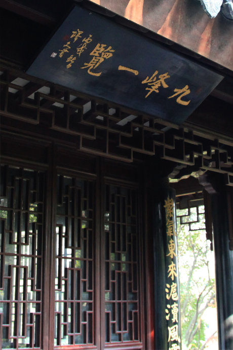 信步踱到山頂的“九峰一覽亭”有四層樓高,這里是全園的精華,援梯而上登上高閣,可遠眺青浦城廓,佘山、天馬山、鳳凰山、小昆山等“松郡九峰”盡收眼前。居高臨下近觀曲水園景,四周的古建筑組合成一個惠暢順諧、自成風貌的有機整體,古木參天掩亭臺樓榭,綠草如茵裹雙池如鏡,隨著目光的流轉,這些勝景便組合成一幅曲水園風景長卷。