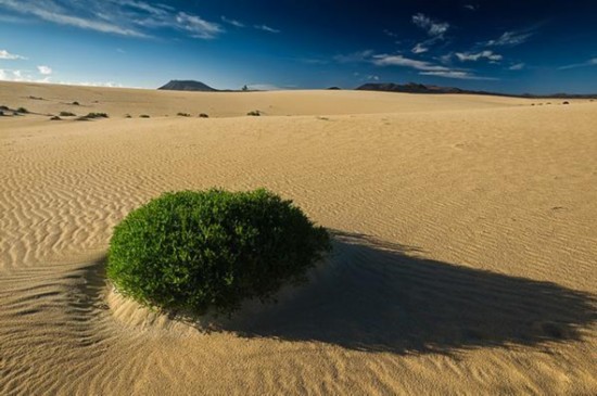 西班牙加納利群島的富特文圖拉島,一株郁郁蔥蔥的綠色植物在沙漠中茁壯成長。富特文圖拉島地勢較低,很難享受到降雨。慶幸的是,偶爾也有攜帶濕氣的信風吹過這座島嶼。富特文圖拉島氣候干旱,只有耐鹽抗旱植物能夠在這里的沙漠和半沙漠地區生存。
