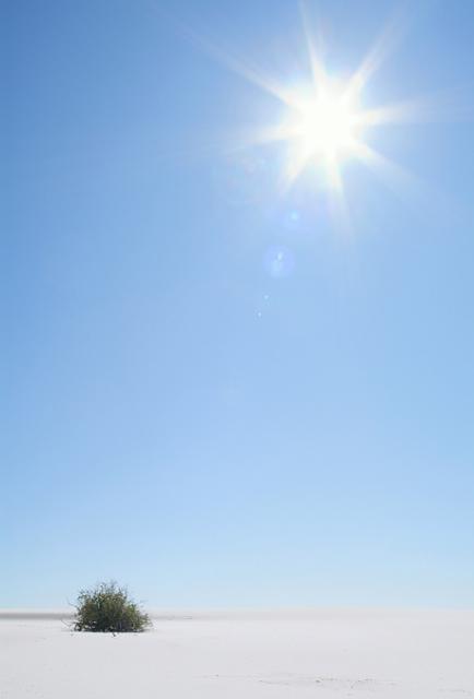 美國(guó)新墨西哥州的白沙國(guó)家公園,烈日下,一株植物正在茁壯成長(zhǎng)。白沙國(guó)家公園的夏季炎熱,冬季寒冷,地表水和地下水均非常短缺,能夠在這種惡劣的環(huán)境下生存說(shuō)明這株植物擁有非凡的適應(yīng)能力。