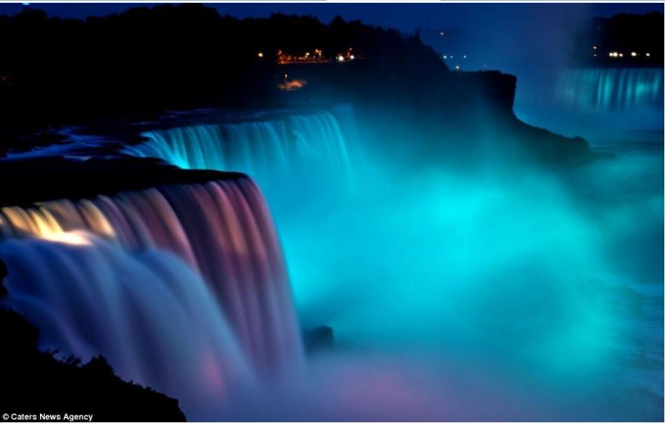 尼亞加拉大瀑布最大水流狀態時,每分鐘可達到168000立方米的水流,在燈光照射下,攝影師等待數個小時拍攝到階式瀑布絲綢般的柔滑效果。