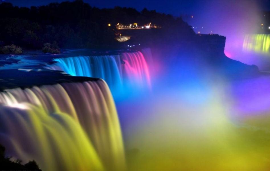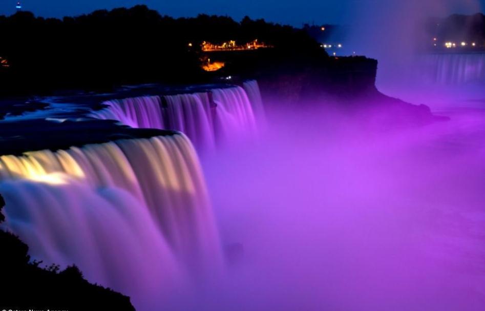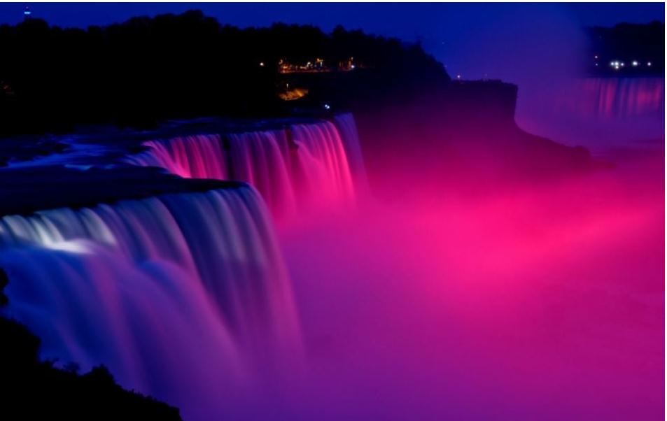 燈光照亮尼亞加拉大瀑布獲得美麗的效果始于1925年,燈光照射下該瀑布可以持續(xù)改變色彩,呈現(xiàn)出令人驚異的視覺效果。最大水流波峰時每分鐘可達到168000立方米水流,該瀑布位于加拿大安大略省和美國紐約市交界處。