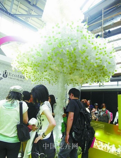 與傳統PET塑料瓶相比,植物瓶采用新技術制造而成,30%以上材料取自于植物,從而降低了對非再生資源的依賴性。為倡導環保理念,在臺灣花博會上,設計師用扭轉植物瓶的方式,制作了花樹以及憨態可掬的狗熊、熊貓等動物形象,以引導人們支持和消費環保產品,保護自然及自然界生長的植物和動物。