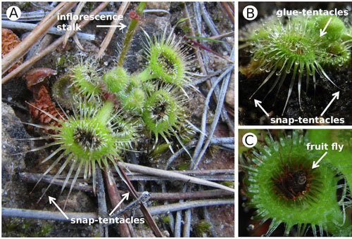 粘性毛氈苔的陷阱葉片上覆蓋著粘性觸須,一些小型動物一旦粘在葉片上在幾分鐘或幾小時內就被包裹起來。這種圓葉結構的毛氈苔生長在營養缺乏的澳大利亞黑森林沼澤地帶,這里也生長著捕蠅草。此外,這種植物葉片上還長有一種非粘性捕食觸須,一旦獵物被粘在性性葉片上,這個非粘性捕食觸須便在75毫秒內朝向獵物目標,其速度快于著名捕蠅草的捕獵動作。
