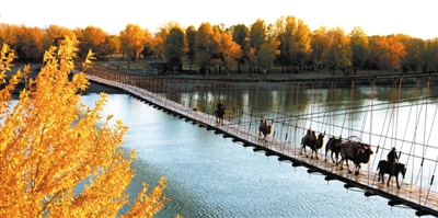新疆布爾津縣的五彩灘,駝隊(duì)跨過額爾齊斯河