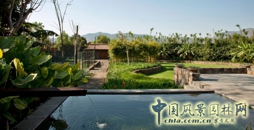 距離房屋最遠處沿著河流的較高層,是在建設過程中不斷堆土形成,最后形成具有谷地叢林感覺的戶外活動場所。以收集了不斷吸引蝴蝶的橙色燈籠、成片的龍舌蘭和巖石為特點。同時,在一側還有柑橘園和菜園,以及大量的樹。