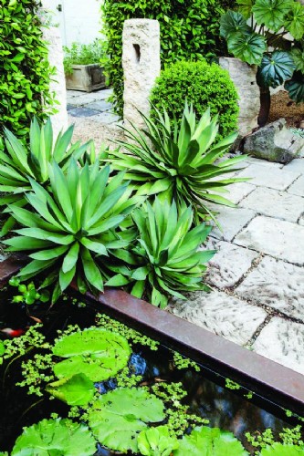 龍舌蘭緊鄰青銅器外圍的水池。球型黃楊與矮石柱并列擺放,大葉秋海棠是其中主要的植物之一。