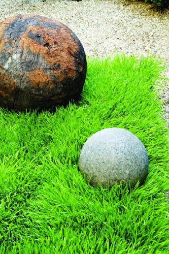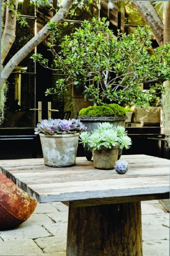 復古和再利用是Shrader設計花園的主要特征。上圖中的桌面是由回收腳手架改造成的,其支架是柚木樹干,桌上的金屬球是有些腐化了的浮標。