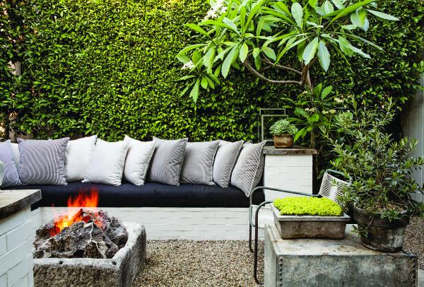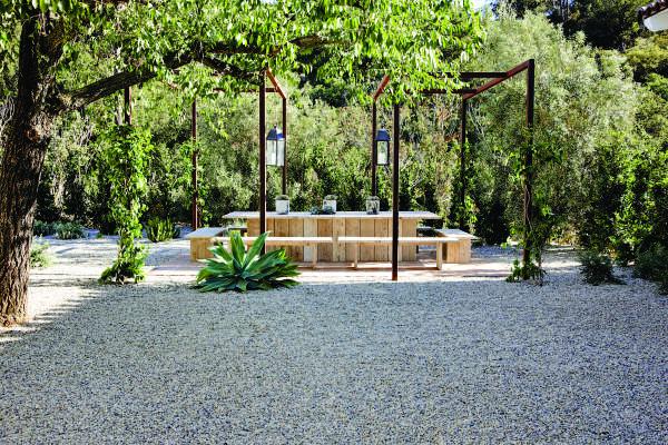 花園中的沙發也是由磚石做成,與旁邊的房屋相稱。中央的篝火臺是由法國一舊水井石做成。靠墻的桌子是一個倒置了的鐵槽,上面擺放有橄欖盆景,花盆外壁陳舊。其右前方是一株雞蛋花。