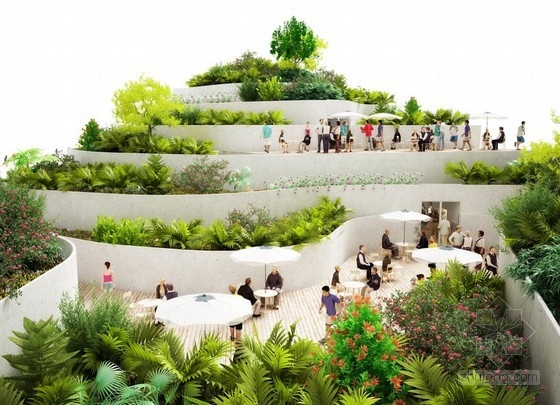 由荷蘭NL architects建筑事務(wù)所設(shè)計(jì)的“三亞超級(jí)市場(chǎng)”將于2014年完工,這個(gè)項(xiàng)目位于中國(guó)海南省三亞,建筑師在一個(gè)抬升的梯田式花園下方擴(kuò)建了一個(gè)地下公共空間。建筑位于三亞度假區(qū)內(nèi),將包括三座21層高的住宅大樓,并帶有半開放庭院。住宅建筑之間是大量的景觀綠化和園林建筑,為居住者創(chuàng)造了一個(gè)集社交、商業(yè)和娛樂活動(dòng)為一體的交互式生活環(huán)境。三角形的超市建筑將包含許多公共戶外空間,它與水平延伸的傳統(tǒng)超市不同,有一部分空間在地下,與每座住宅樓相連,廢物排出和商品運(yùn)輸?shù)群笄诠δ芏茧[藏在這個(gè)地下空間中,不會(huì)出現(xiàn)在地上。屋頂由一系列凸出的臺(tái)階組成,上面種植了許多綠色植物,巨大的玻璃窗門墻、小零售商鋪掩映其中,綠植還標(biāo)示了建筑的入口。在周圍的住宅塔樓間,這個(gè)超市建筑成為一個(gè)抬升的綠色花園,同時(shí)將一系列功能空間和通往超市核心的交通道路暴露在外。