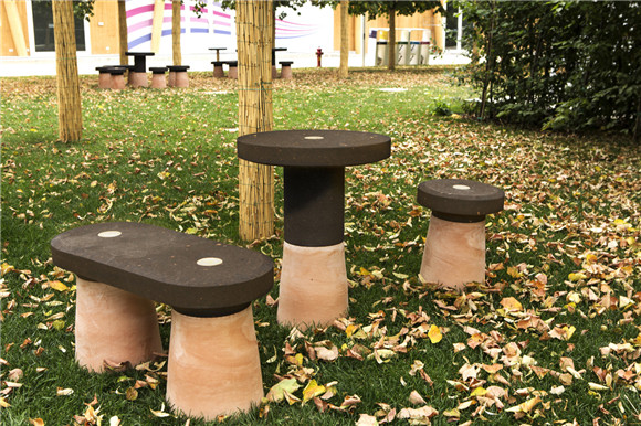 這個小“公園”,由一群來自世界各地的創(chuàng)意鬼才共同設計,其中的桌椅等通通都選用了木頭、軟木、Galestro陶土等材料制成,所有材料都是純天然的,100%可回收。有趣的是這些展品可以很輕松地拆開,因為它們組裝的時候根本不加一滴膠水。