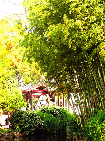 古猗園也是竹品種的聚集地,猗園景區石旁或路邊,庭前堂后、粉墻邊角,零星點綴叢竹三五群和小片竹圃外,在青清園內種植龜甲竹、方竹、紫竹,還有湘妃竹、鳳尾竹、小琴絲竹等,重點展示適宜上海地區生長的竹代表性品種,如此豐富多姿的竹類品種集中在一處,在上海五大古典園林中,古猗園位居之首。