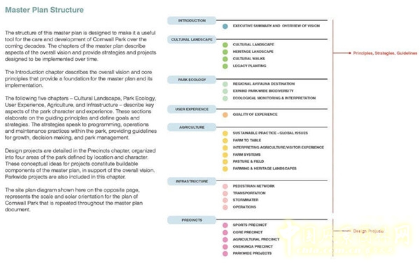 這是景觀設計師完成的指導新西蘭最有價值的城市公共空間之一——康沃爾公園百年發展的總體規劃。它的設計基于長時空跨度的思考,權衡了3個重要的元素:毛利人的文化景觀、早期定居者和創始人的愿景、新西蘭農業景觀和項目地生態價值。總體規劃也兼顧了公園項目、基礎配套設施建設。由此產生的規劃增強了公園維持健康的城市生態的能力,將在未來百年內給不同年齡的游客帶來啟迪和快樂。