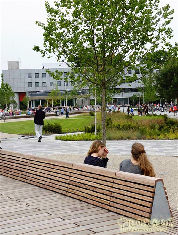 極易辨識的日光休息區與水景區共同組成了廣場中最具吸引力的景觀。休息區由普通的木質長椅逐漸延伸,變成了流動的木甲板,在廣場中央為市民提供了充足的享受日光的空間。