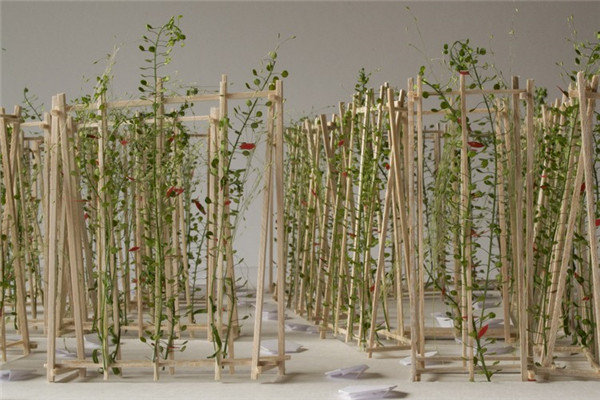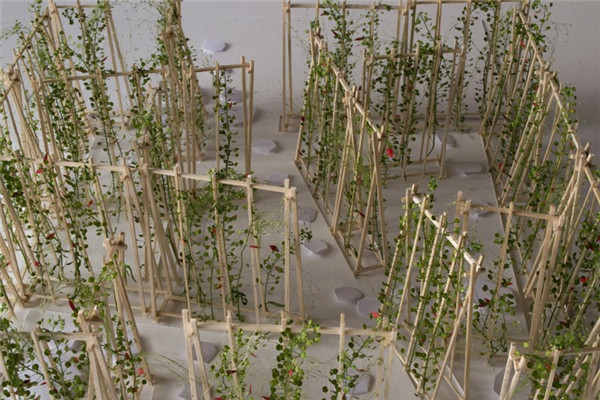 建筑是一個被花環繞的綠色墓地。你可以從陡峭地面上覆蓋的小石頭上進入。進入之后,你會感到輕質木架上的豆子形成了道路。墻壁劃分了空間,成為了一系列小的隱藏公園,各自獨立。這個蠶繭般的建筑很適合玩躲貓貓的游戲。很多地方看起來十分隱蔽、不可到達。