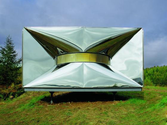 第一個要介紹的設(shè)計作品是由倫敦事務(wù)所Softroom完成設(shè)計。它坐落在一片開敞的草坪之上,金屬鏡面外皮讓建筑超脫于自然環(huán)境,產(chǎn)生強力的對比,人們可以進入其中躲避糟糕的天氣或者進行短暫的休憩。這個建筑小品中有兩個厚重的鏡面墻體,可以反射周圍的森林草坪等自然環(huán)境。厚重的墻體內(nèi)部有一個金色的圓形的室內(nèi)空間,在這個圓形空間的頂部還設(shè)計有一個彩色的天窗,柔和的日光可以通過彩色天窗而照射到建筑內(nèi)部。該建筑小品還有一個獨特的入口設(shè)計,曲線凹陷的造型顛覆了一般傳統(tǒng)建筑造型手法。正對著入口的地方放置了一個弧形的座椅,座椅上方的墻體上設(shè)置了一個條形的窗戶,為使用者提供廣闊的視野。