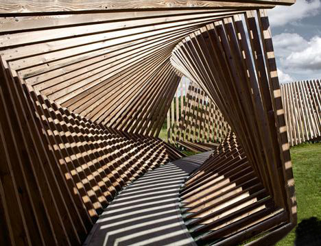 人們穿過這條崎嶇的木環(huán)結(jié)構(gòu)時,能聽見自己的腳步和說話聲的回音。木廊內(nèi)部地面是混凝土鋪筑的,形成一條連續(xù)的走道,200個木制框架尺寸漸增,形成扭曲的整體造型。木制框架里隱蔽安裝了麥克風(fēng),能記錄下木廊中的人發(fā)出的聲音。這些聲音經(jīng)過計算機混音,再通過微型揚聲器播放出去,形成回聲。這個裝置不僅是一個聲音的檔案館,還有助于參觀者感知空間和自我的存在。光從木框之間的縫隙照進木廊,形成條形光影。