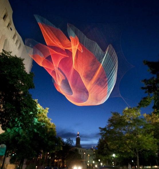 這些彩色網(wǎng)狀結(jié)構(gòu)在空中搭建巨大的漂浮作品,材料柔軟通透。可隨風(fēng)的運動而自由改變形體,配合燈光效果炫目猶如極光,誰能想到這些色彩艷麗,輕盈的隨風(fēng)飄舞的作品,出自一個從來沒有學(xué)過建筑、雕塑、工程的人,她甚至被7所大學(xué)拒絕過申請,她的名字叫珍妮艾克曼。