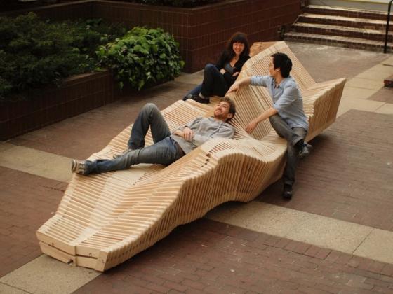 同樣運用木質(zhì)材料的第三個項目,是由哥倫比亞大學(xué)的十個建筑系的學(xué)生設(shè)計了這個Polymorphic多形態(tài)景觀椅,Polymorphic多形態(tài)景觀椅依據(jù)動態(tài)多型方式設(shè)計。Polymorphic多形態(tài)景觀椅由若干片相互獨立的片面組成,這些片面組裝在一起可以組裝成各種形態(tài),結(jié)合而成的椅子能夠根據(jù)場地的崎嶇不平或者場地平坦等方式依據(jù)地勢自由變化。