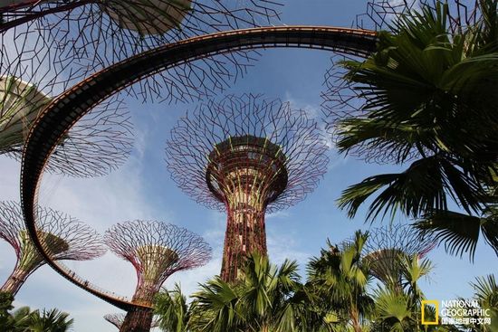 新加坡在這方面已經(jīng)走在了前列,圖中這些名為“超級(jí)樹”的智能綠色植物可以吸收熱量,并提供樹蔭,從而有效控制城市溫度。這些樹實(shí)際上是復(fù)雜的垂直花園,由超過200種植物組成,頂上還加蓋了太陽(yáng)能板。
